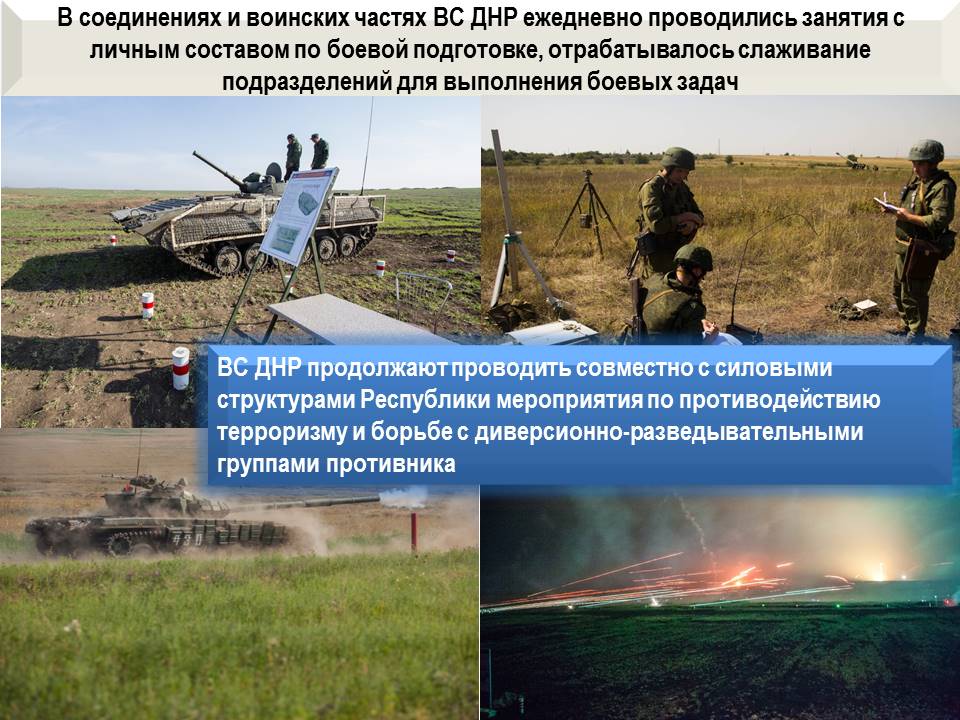 В 2017 году Вооруженные силы ДНР продолжили совершенствовать боевую подготовку, выучку и повышать профессионализм личного состава, проводились тактико-строевые, тактико-огневые занятия, повышалось боевое слаживание подразделений при выполнении задач в обороне и наступлении. Совместно с другими силовыми структурами Республики проводились мероприятия по противодействию терроризму и борьбе с диверсионно-разведывательными группами противника. Социально незащищенным гражданам Республики регулярно оказывалась гуманитарная помощь.