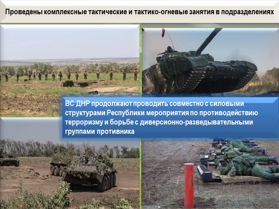 На прошедшей неделе в соединениях и воинских частях Вооруженных сил ДНР проведены батальонно-тактические учения, комплексные тактические и тактико-огневые занятия в подразделениях.