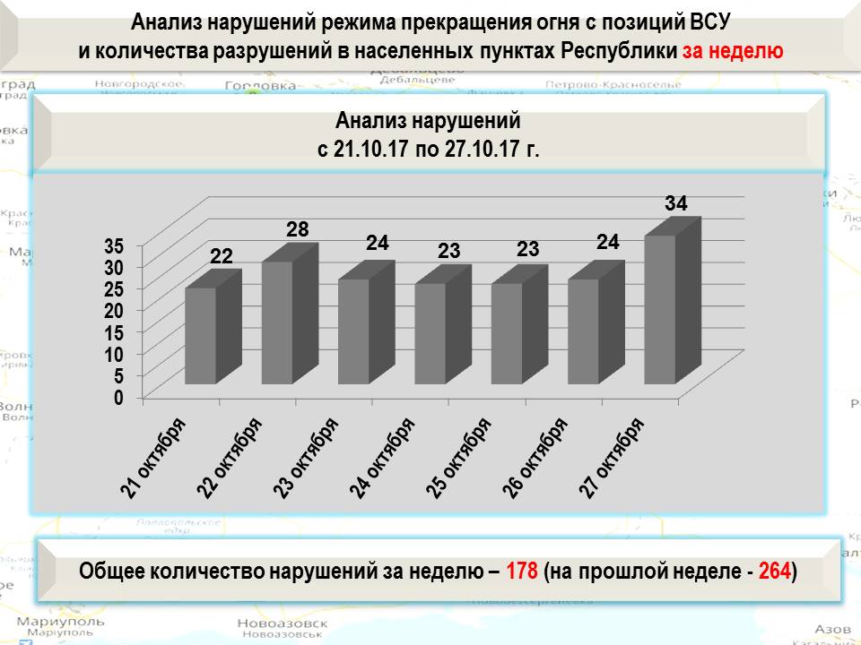Всего за прошедшую неделю противник СТО СЕМЬДЕСЯТ ВОСЕМЬ раз нарушил режим прекращения огня, и применил по территории Республики СЕМЬСОТ ТРИДЦАТЬ ТРИ артиллерийских, танковых снарядов и мин калибром 120 и 82- мм.