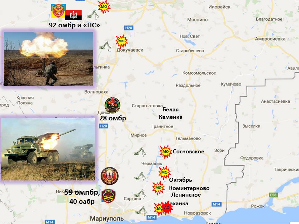 На Мариупольском направлении противник выпустил ТРИ ракеты из реактивной системы залпового огня «ГРАД», ПЯТНАДЦАТЬ артиллерийских снарядов калибром 152 и 122-мм, СТО ДВАДЦАТЬ ШЕСТЬ мин калибром 120 и 82 мм, по районам ПЯТИ населенных пунктов.