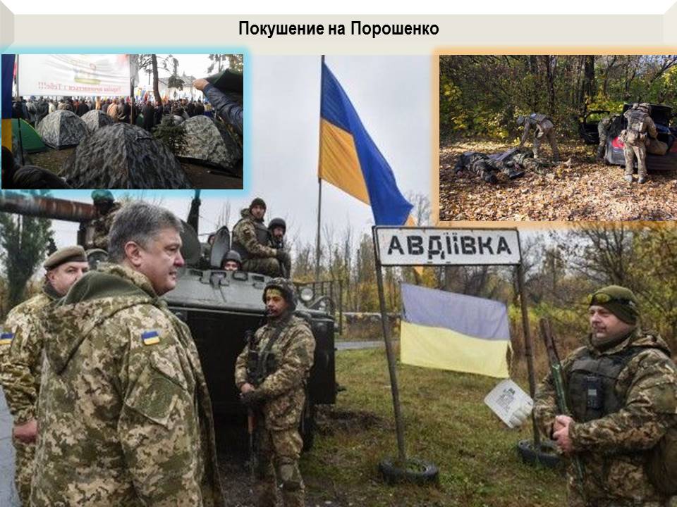 Стоит отметить факт визита 22 октября П.Порошенко в н.п. АВДЕЕВКА, в расположение 72 бригады ВСУ. Во время которого, по данным СБУ были устранены двое лиц, готовивших покушение на президента Украины. А через некоторое время, после негативной реакции оппозиционных сил, Служба Безопасности отказалась от своих сообщений, и приступила к их опровержению.