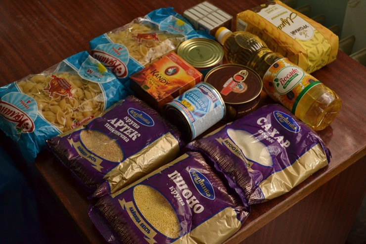 В состав наборов вошли крупы, макаронные изделия, консервы, мука, масло, сгущённое молоко, чай и спички.