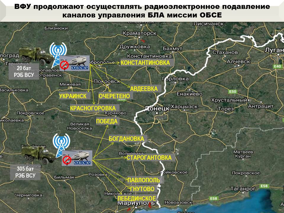 Для борьбы с беспилотными летательными аппаратами наблюдателей ОБСЕ, оккупанты продолжают использовать мобильные группы РЭБ от 20-го и 305-го отдельных батальонов РЭБ ВСУ, наибольшая активность которых отмечается в районах сосредоточения запрещённого вооружения вблизи н.п. ГНУТОВО, ЛЕБЕДИНСКОЕ, ПАВЛОПОЛЬ, СТЕПАНОВКА, СТАРОГНАТОВКА, БОГДАНОВКА, КОНСТАНТИНОВКА, АВДЕЕВКА, КРАСНОГОРОВКА, ОЧЕРЕТИНО, УКРАИНСК и ПОБЕДА.