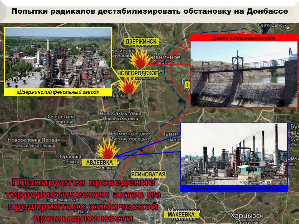 Для проведения теракта заговорщики рассматривают несколько объектов на территории подконтрольной Киеву, в частности Авдеевский коксохимический завод и Дзержинский фенольный завод. На данных объектах содержится более 60-ти хранилищ со значительным количеством химических веществ, утечка которых неминуемо приведет к заражению местности на десятилетия.