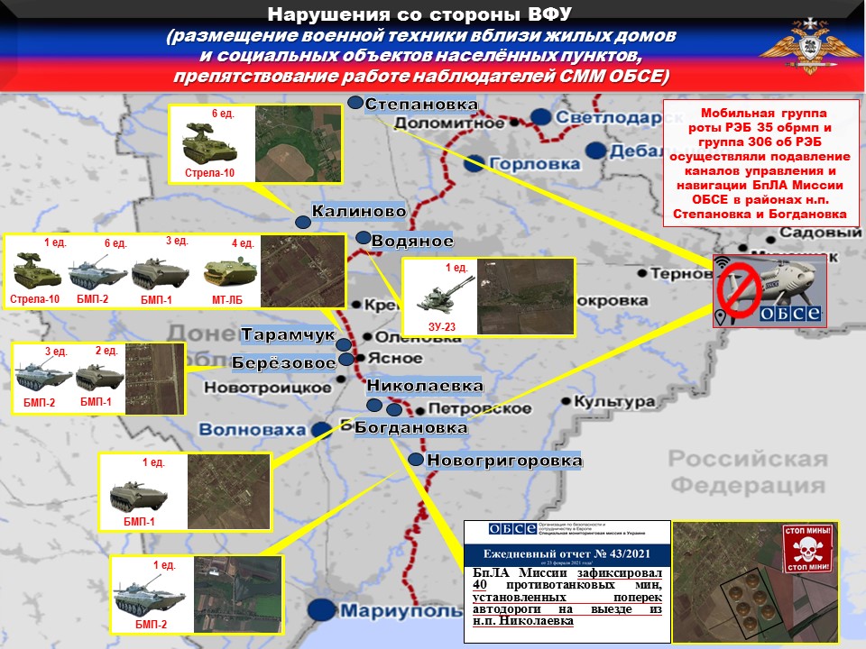 В нарушении ТРЕТЬЕГО пункта дополнительных мер, выявлено размещение ДВАДЦАТИ ВОСЕМИ единиц вооружения и военной техники ВФУ вблизи жилых домов и муниципальных объектов на подконтрольной Украине территории.