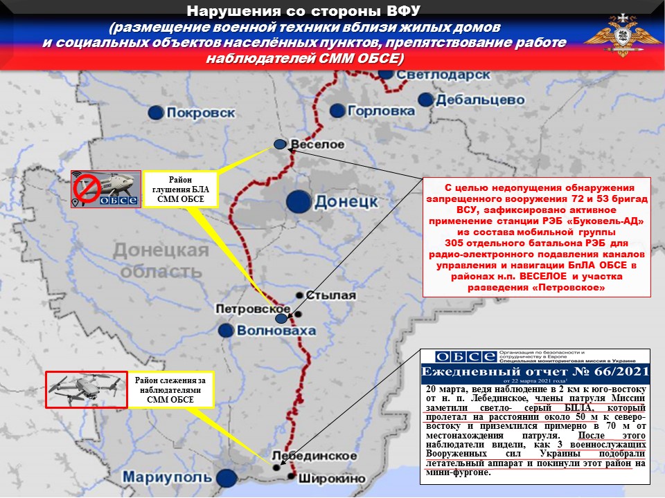 Украинская сторона продолжает препятствовать работе Международных наблюдателей, блокируя работу беспилотников СММ ОБСЕ. Так, с целью недопущения обнаружения запрещенного вооружения 72 и 53 бригад ВСУ, зафиксировано применение станций радио подавления сигналов БЛА «Буковель-АД» из состава мобильной группы 305 отдельного батальона РЭБ ВФУ в районах н.п. ВЕСЕЛОЕ и участка разведения «Петровское».