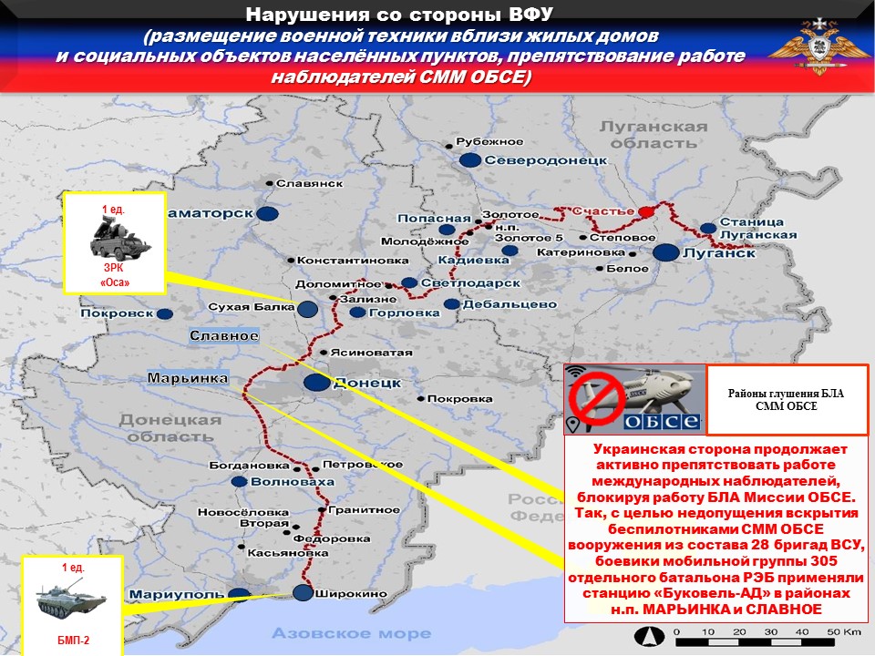 Украинская сторона продолжает активно препятствовать работе международных наблюдателей, блокируя работу БЛА Миссии ОБСЕ. Так, с целью недопущения вскрытия беспилотниками СММ ОБСЕ вооружения из состава 28 бригады ВСУ, боевики мобильной группы 305 отдельного батальона РЭБ применяли станцию «Буковель-АД» в районах н.п. МАРЬИНКА и СЛАВНОЕ.