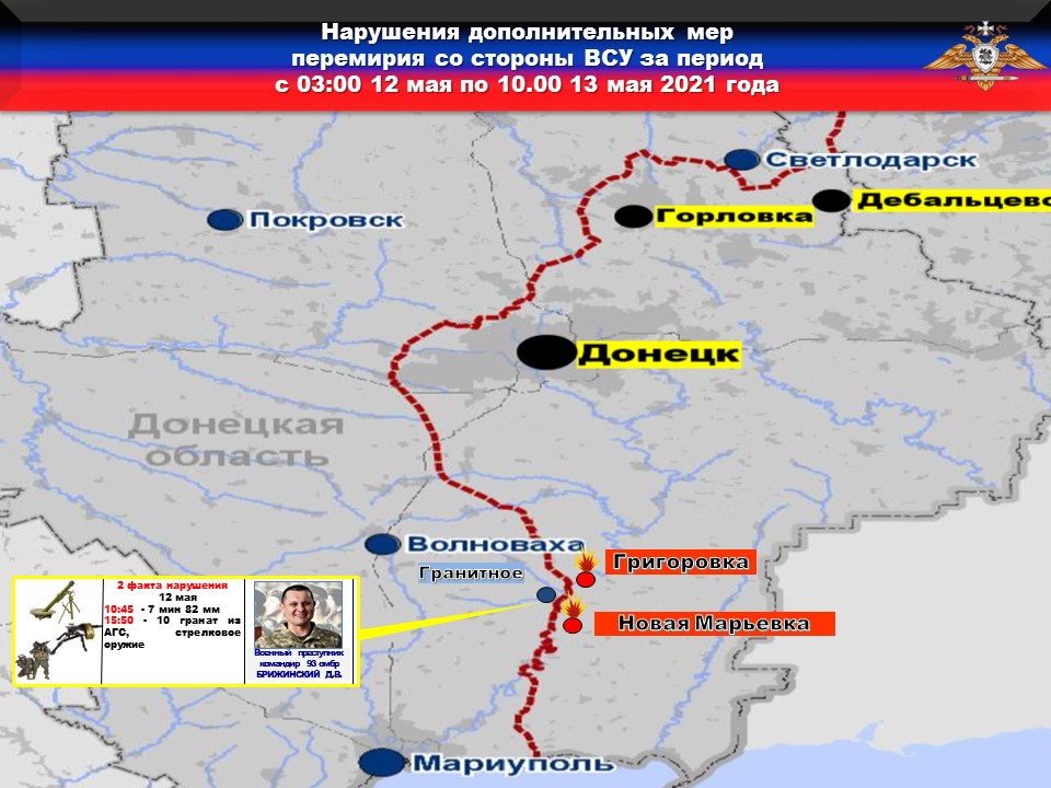 На Донецком направлении боевики 93-й омбр с позиций в районе н.п. ГРАНИТНОЕ обстреляли из 82-мм миномётов район н.п. ГРИГОРОВКА, выпустив СЕМЬ мин, а также с применением АГС и стрелкового оружия подвергся обстрелу район н.п. НОВАЯ МАРЬЕВКА, выпущено ДЕСЯТЬ гранат.