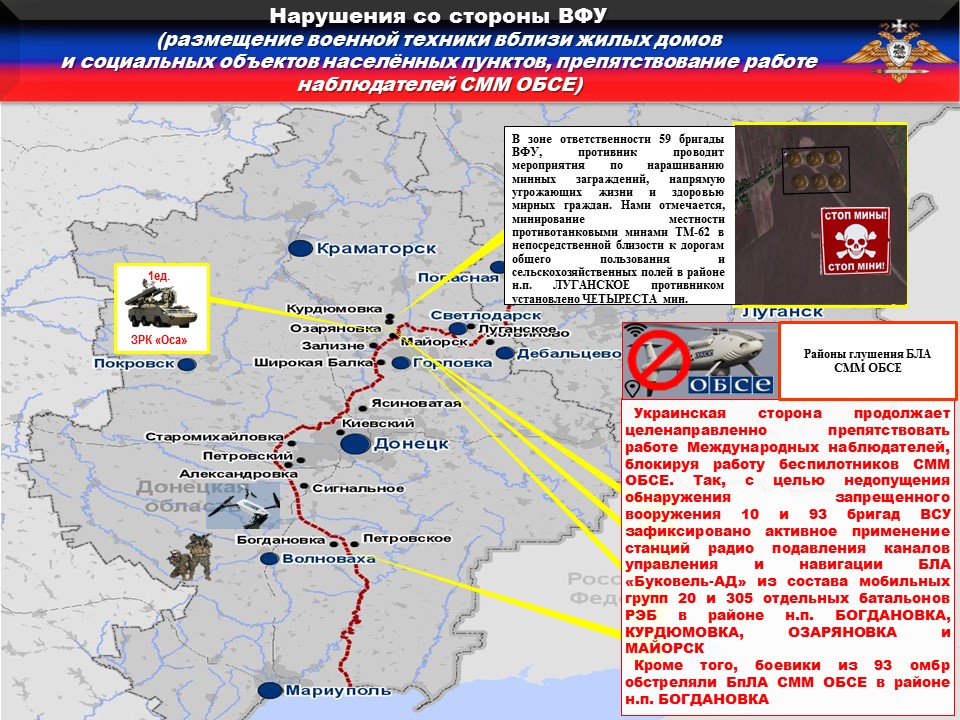 Украинская сторона продолжает целенаправленно препятствовать работе Международных наблюдателей, блокируя работу беспилотников СММ ОБСЕ. Так, с целью недопущения обнаружения запрещенного вооружения 10 и 93 бригад ВСУ зафиксировано активное применение станций радио подавления каналов управления и навигации БЛА «Буковель-АД» из состава мобильных групп 20 и 305 отдельных батальонов РЭБ в районе н.п. БОГДАНОВКА, КУРДЮМОВКА, ОЗАРЯНОВКА и МАЙОРСК.