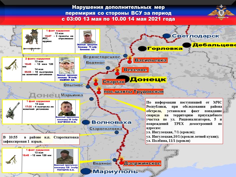Также, боевики 3 батальона 28 омбр по приказу комбрига Марченко с направления н.п. МАРЬИНКА совершили ЧЕТЫРЕ выстрела из зенитной установки по поселку шахты «Трудовская».