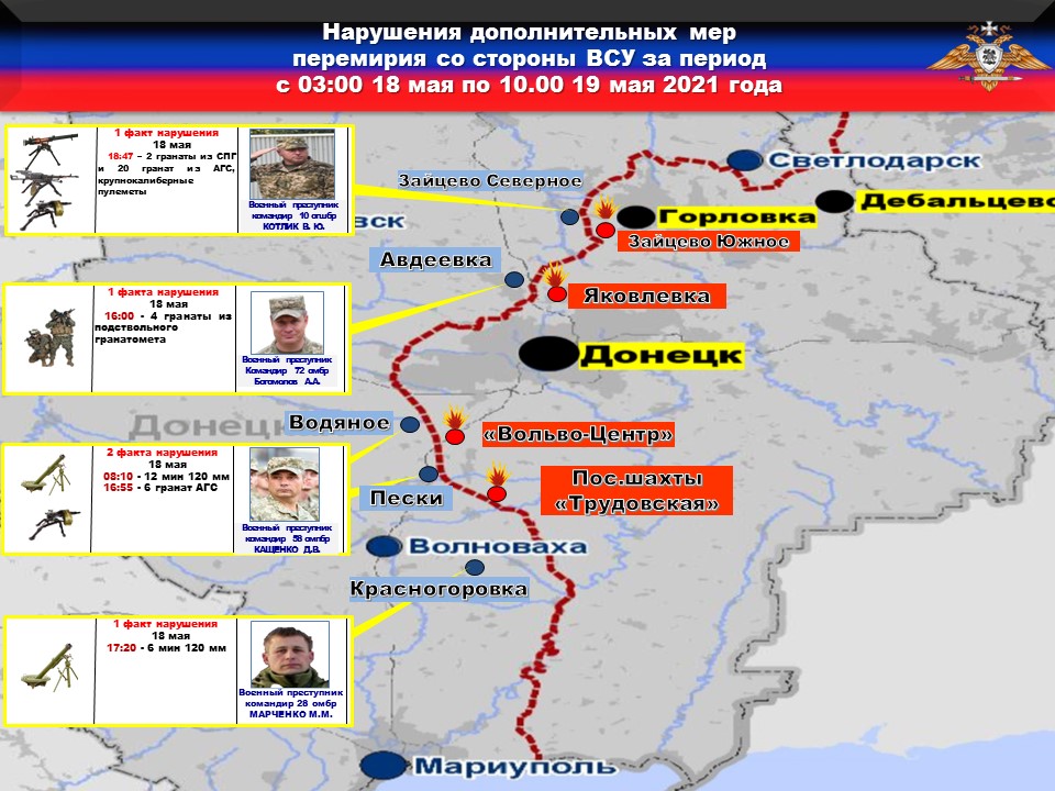 Данные факты нарушений со стороны украинских боевиков также подтверждаются наблюдателями Миссии ОБСЕ в своем отчете за 18.05.2021 г.