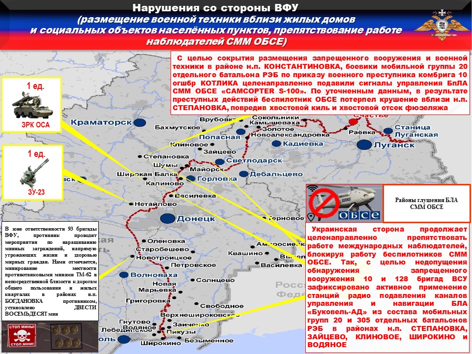 Украинская сторона продолжает целенаправленно препятствовать работе международных наблюдателей, блокируя работу беспилотников СММ ОБСЕ. Так, с целью недопущения обнаружения запрещенного вооружения 10 и 128 бригад ВСУ зафиксировано активное применение станций радио подавления каналов управления и навигации БЛА «Буковель-АД» из состава мобильных групп 20 и 305 отдельных батальонов РЭБ в районах н.п. СТЕПАНОВКА, ЗАЙЦЕВО, КЛИНОВОЕ, ШИРОКИНО и ВОДЯНОЕ.
