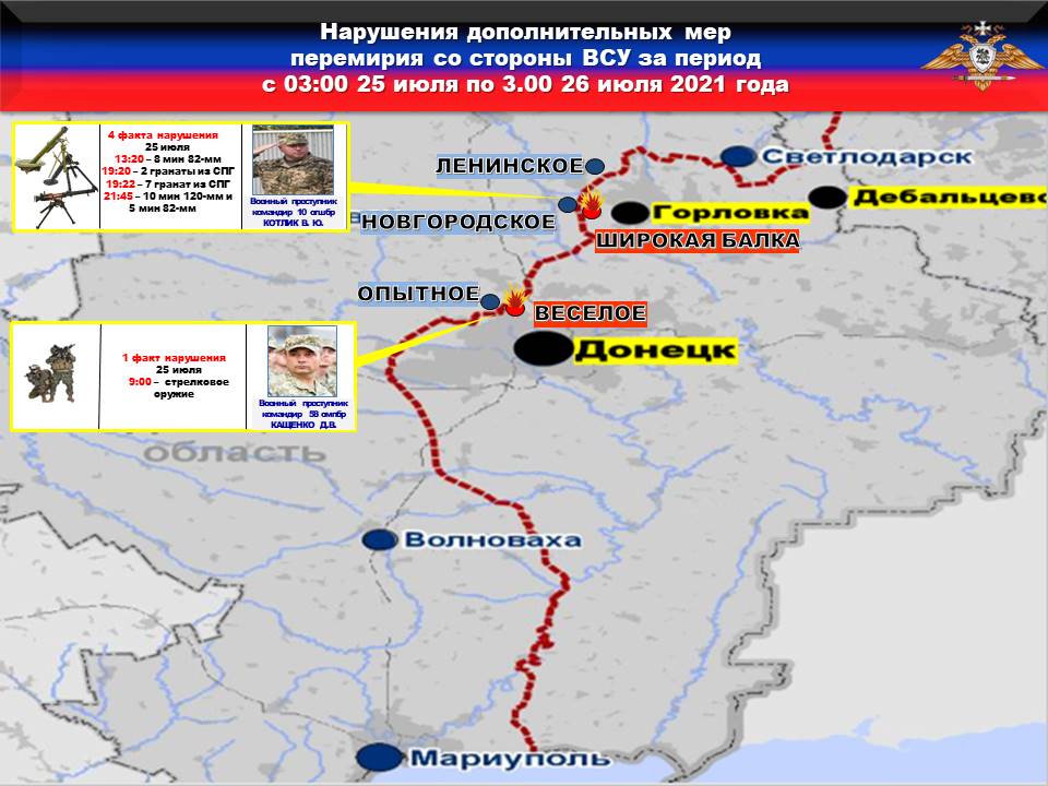 Так, за прошедшие сутки со стороны украинских боевиков зафиксировано ПЯТЬ нарушений ВТОРОГО пункта Комплекса дополнительных мер по контролю за соблюдением режима прекращения огня. Всего противник выпустил ТРИДЦАТЬ ДВЕ мины и гранаты по населенным пунктам Республики.