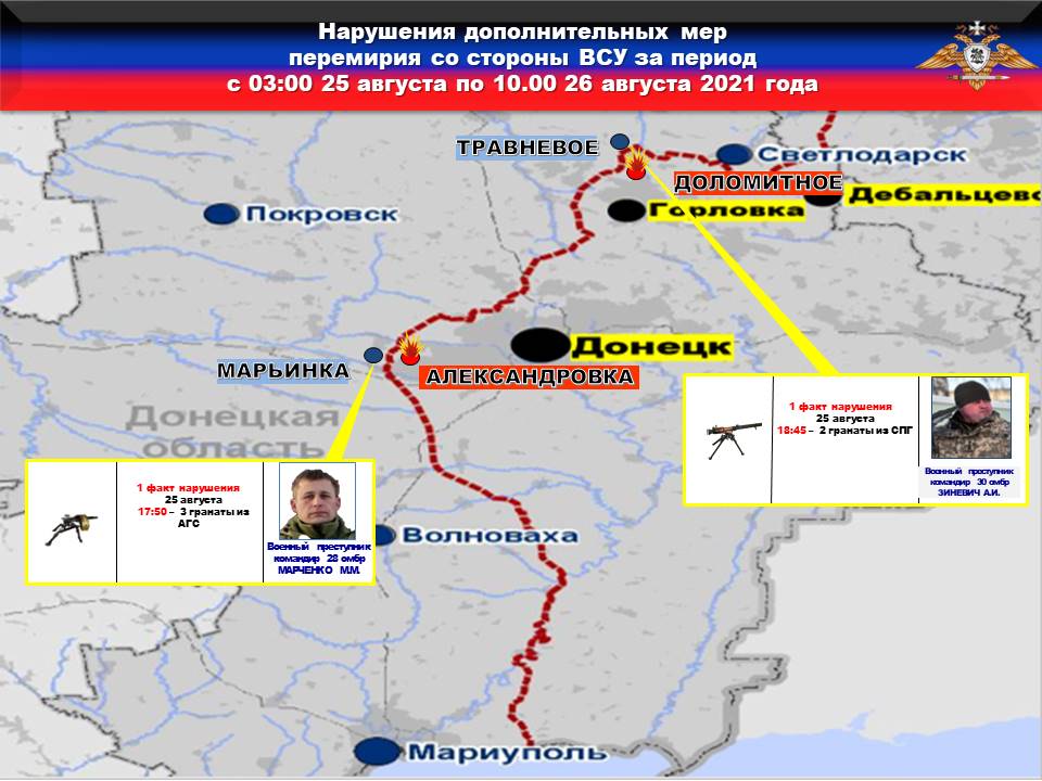 Факты нарушений в оперативном порядке доведены до представителей украинской стороны в СЦКК, с целью своевременного принятия мер к нарушителям перемирия и исключения фальсификации данных о нарушениях режима прекращения огня со стороны украинских боевиков.