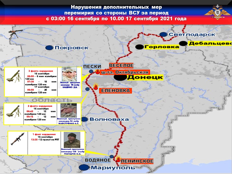 Международные наблюдатели продолжают фиксировать военные преступления ВСУ в отношении мирного населения. Так, в отчете от 16 сентября 2021 года, наблюдатели подтвердили факт ранения двух мирных жителей в результате обстрела 8 сентября 2021 года с позиций 58 бригады Киевского района г. Донецк.