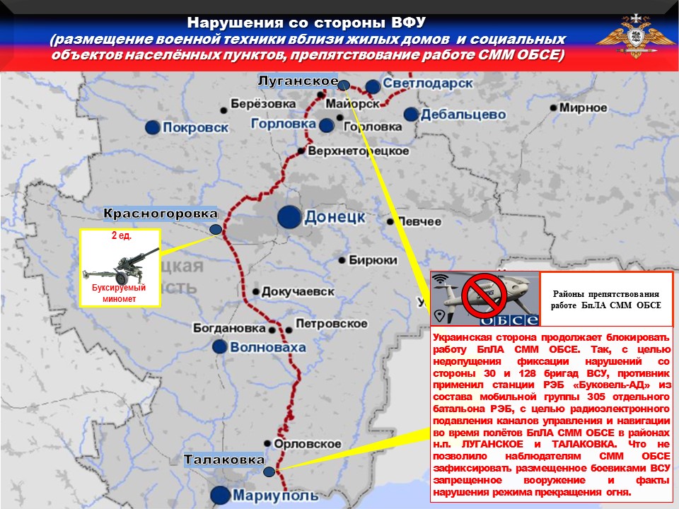 Украинская сторона продолжает блокировать работу БпЛА СММ ОБСЕ. Так, с целью недопущения фиксации нарушений со стороны 30 и 128 бригад, противник применил станции РЭБ «Буковель-АД» из состава мобильной группы 305 отдельного батальона РЭБ, для радиоэлектронного подавления каналов управления и навигации во время полётов БпЛА СММ ОБСЕ в районах н.п. ЛУГАНСКОЕ и ТАЛАКОВКА.