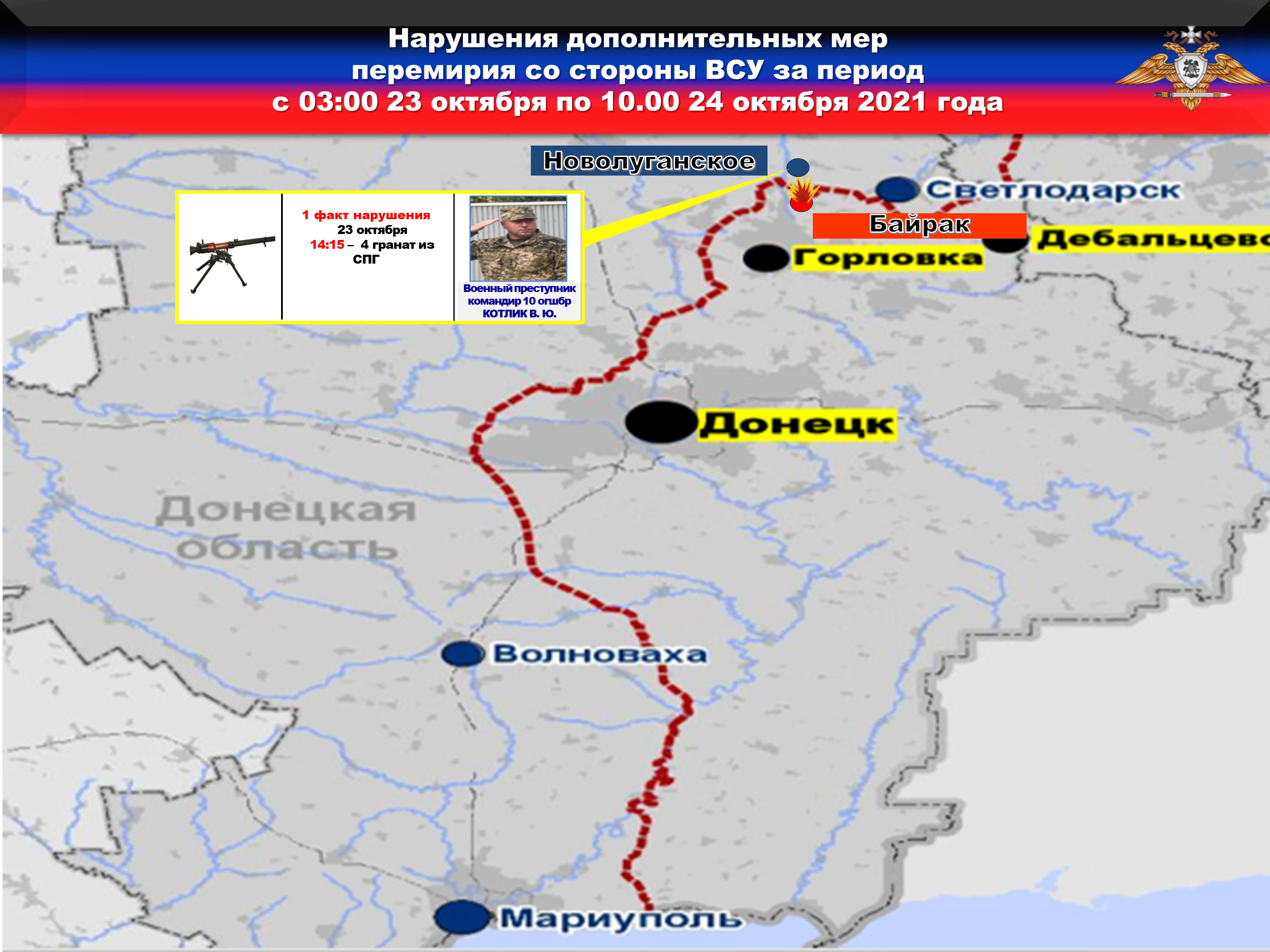 На Горловском направлении боевики 10 бригады с позиций в районе н.п. НОВОЛУГАНСКОЕ по приказу военного преступника КОТЛИКА обстреляли из СПГ район н.п. БАЙРАК, выпустив 4 гранаты.