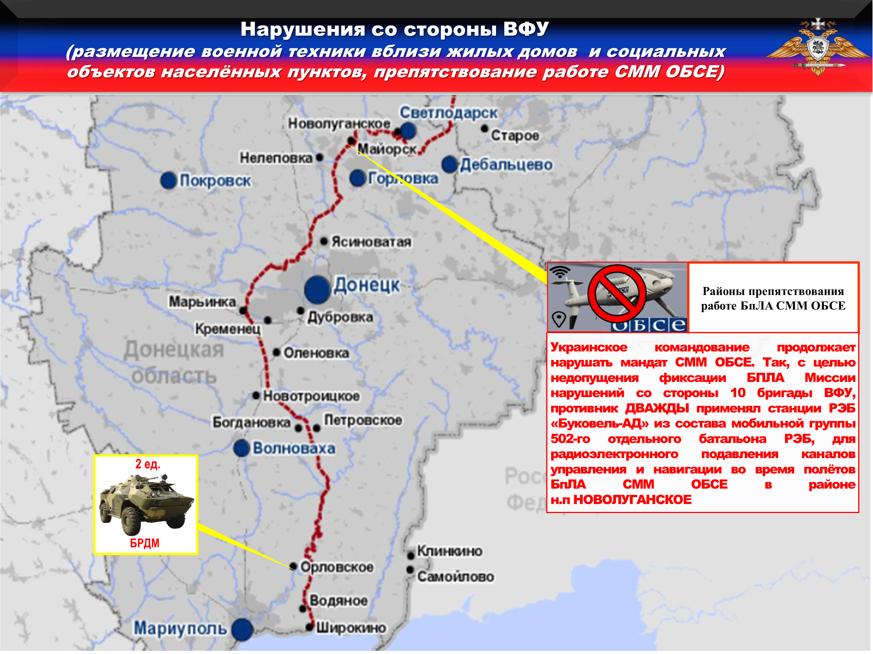 Украинское командование продолжает нарушать мандат СММ ОБСЕ. Так, с целью недопущения фиксации БПЛА Миссии нарушений со стороны 10 бригады, противник ДВАЖДЫ применял станции РЭБ «Буковель-АД» из состава мобильной группы 502-го отдельного батальона РЭБ, для радиоэлектронного подавления каналов управления и навигации во время полётов БпЛА СММ ОБСЕ в районе н.п НОВОЛУГАНСКОЕ.