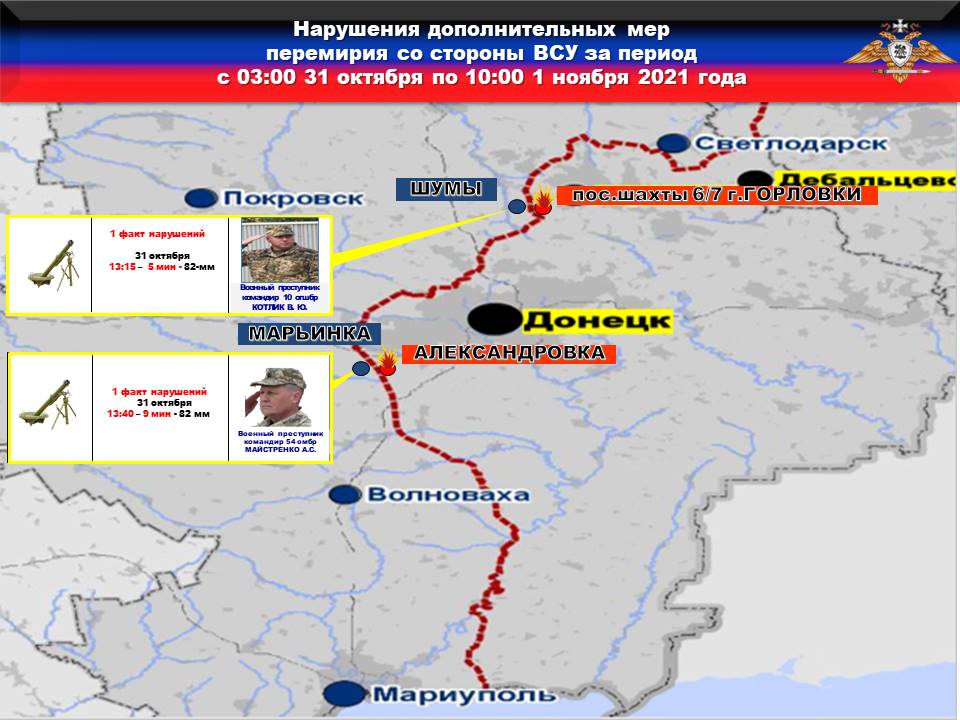 На Донецком направлении боевики 54 бригады по приказу командира МАЙСТРЕНКО, с позиций в районе н.п. МАРЬИНКА выпустили девять 82-мм мин по н.п. АЛЕКСАНДРОВКА.