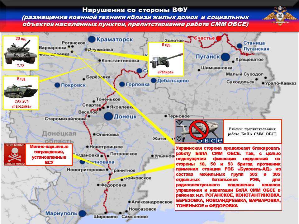 Украинская сторона продолжает блокировать работу БпЛА СММ ОБСЕ. Так, с целью недопущения фиксации нарушений со стороны 10, 58 и 93 бригад противник применил станции РЭБ «Буковель-АД» из состава мобильных групп 502 и 305 отдельных батальонов РЭБ, для радиоэлектронного подавления каналов управления и навигации БпЛА СММ ОБСЕ в районах н.п. РОГАНСКОЕ, КОНСТАНТИНОВКА, БЕРЕЗОВКА, НОВОАНДРЕЕВКА, ВАРВАРОВКА, ТОНЕНЬКОЕ и ФЕДОРОВКА.