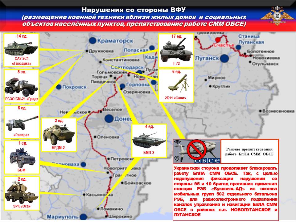 В нарушение ТРЕТЬЕГО пункта дополнительных мер, выявлено размещение ВОСЬМИДЕСЯТИ ПЯТИ единиц вооружения и военной техники украинских вооруженных формирований вблизи жилых домов и муниципальных объектов на подконтрольной Украине территории: