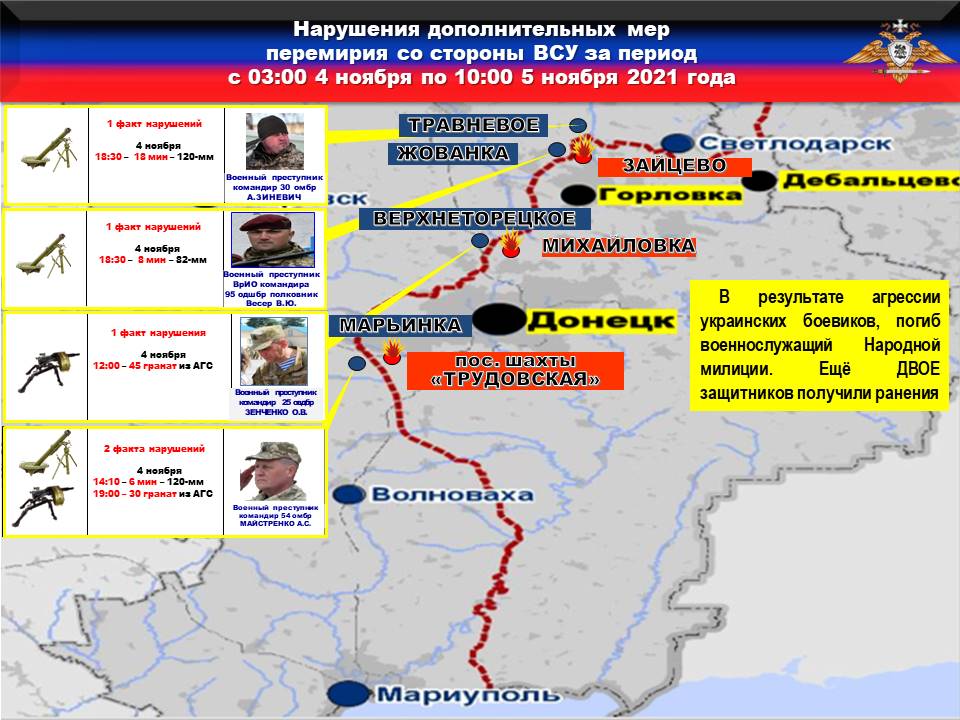 Также н.п. ЗАЙЦЕВО подвергся минометному обстрелу с позиций 30 бригады, расположенных в районе н.п. ТРАВНЕВОЕ. Противник выпустил по району населенного пункта 18 мин калибром 120 мм.