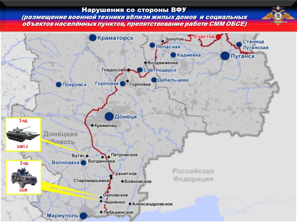 В нарушение ТРЕТЬЕГО пункта дополнительных мер, выявлено размещение ШЕСТИ единиц вооружения и военной техники украинских вооруженных формирований вблизи жилых домов и муниципальных объектов на подконтрольной Украине территории: