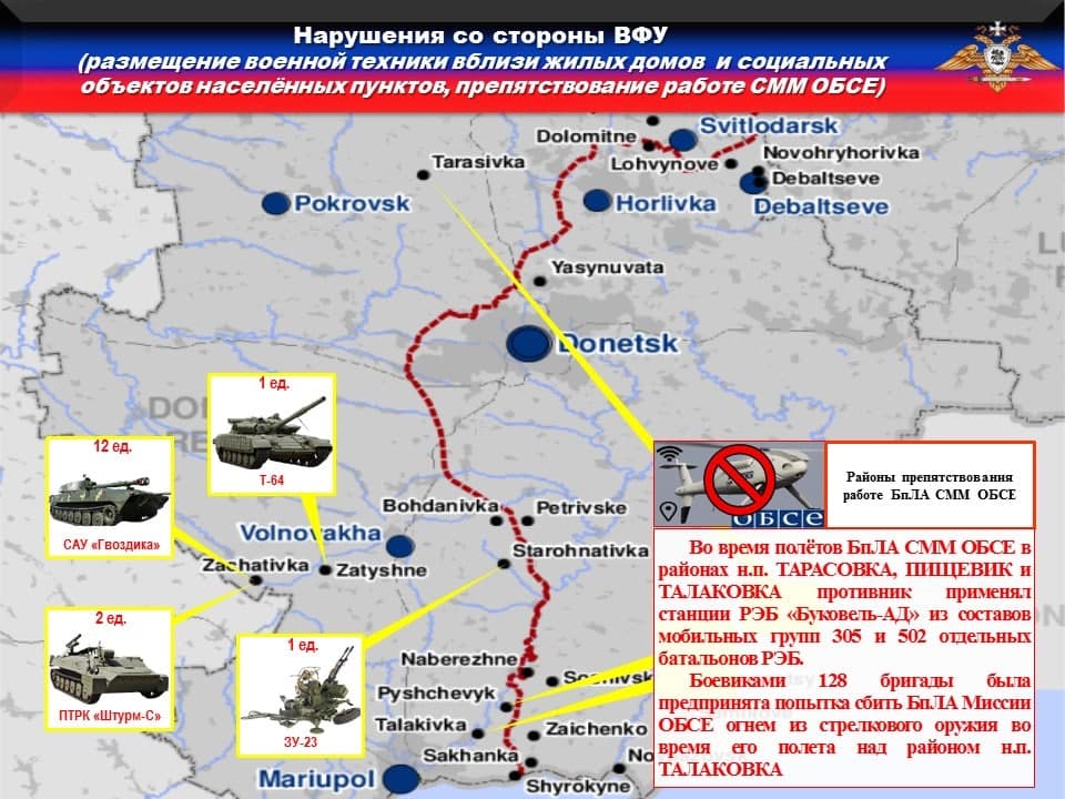 Украинская сторона продолжает блокировать работу БпЛА ОБСЕ. Так, с целью недопущения фиксации наблюдателями миссии размещения запрещенного вооружения 95 и 128 бригад, для радиоэлектронного подавления каналов управления и навигации во время полёта БпЛА СММ ОБСЕ в районах н.п. ТАРАСОВКА, ПИЩЕВИК и ТАЛАКОВКА противник применял станции РЭБ «Буковель-АД» из составов мобильных групп 305 и 502 отдельных батальонов РЭБ.