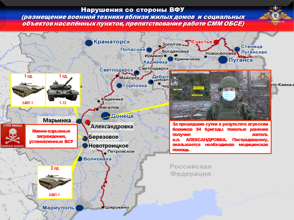В нарушение ТРЕТЬЕГО пункта дополнительных мер, киевские оккупанты разместили ЧЕТЫРЕ единицы бронетехники в подконтрольных населенных пунктах: танк T-72 и боевую машину пехоты БМП-1 из состава 1-го механизированного батальона 54-й омбр в жилом районе н.п. МАРЬИНКА и ДВЕ боевые машины пехоты БМП-1 из состава мотопехотного батальона 53-й омбр в н.п. НОВОТРОИЦКОЕ.