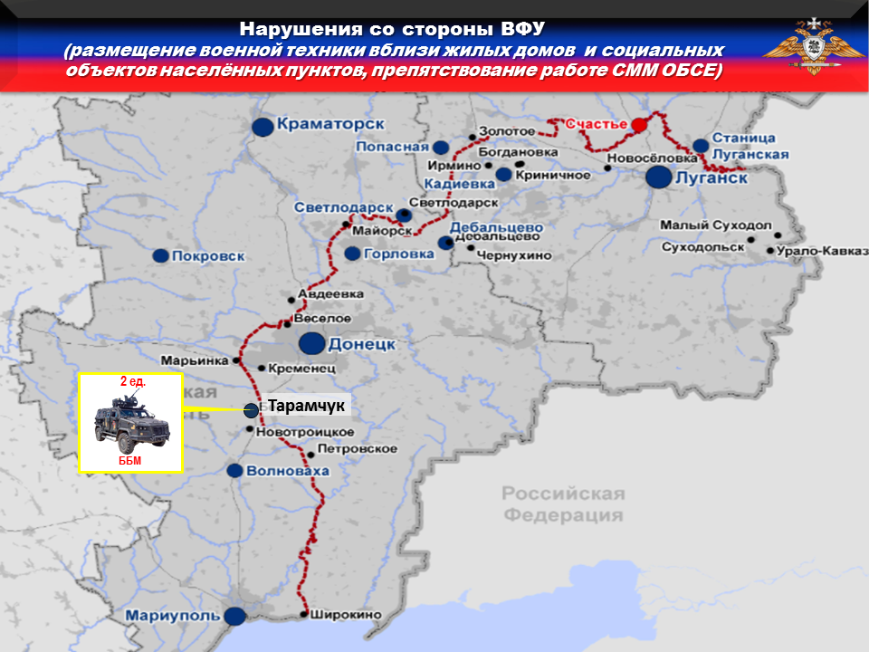 В нарушение ТРЕТЬЕГО пункта дополнительных мер, киевские оккупанты разместили ДВЕ боевые бронированные машины из состава 46-го ошб 54-й бригады вблизи домостроений в н.п. ТАРАМЧУК.