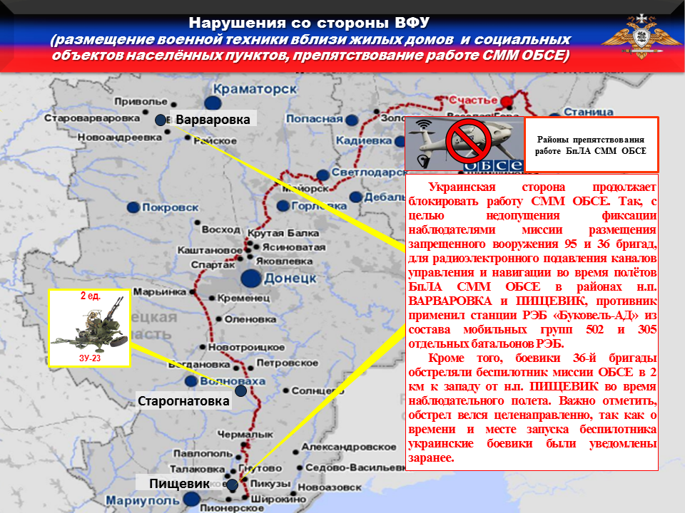 Украинская сторона продолжает блокировать работу СММ ОБСЕ. Так, с целью недопущения фиксации наблюдателями миссии размещения запрещенного вооружения 95 и 36 бригад, для радиоэлектронного подавления каналов управления и навигации во время полётов БпЛА СММ ОБСЕ в районах н.п. ВАРВАРОВКА и ПИЩЕВИК, противник применил станции РЭБ «Буковель-АД» из состава мобильных групп 502 и 305 отдельных батальонов РЭБ.