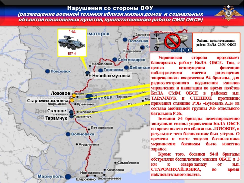 Украинская сторона продолжает блокировать работу БпЛА ОБСЕ. Так, с целью недопущения фиксации наблюдателями миссии размещения запрещенного вооружения 54 бригады, для радиоэлектронного подавления каналов управления и навигации во время полётов БпЛА СММ ОБСЕ в районах н.п. ТАРАМЧУК и СТЕПНОЕ противник применил станцию РЭБ «Буковель-АД» из состава мобильной группы 305 отдельного батальона РЭБ.