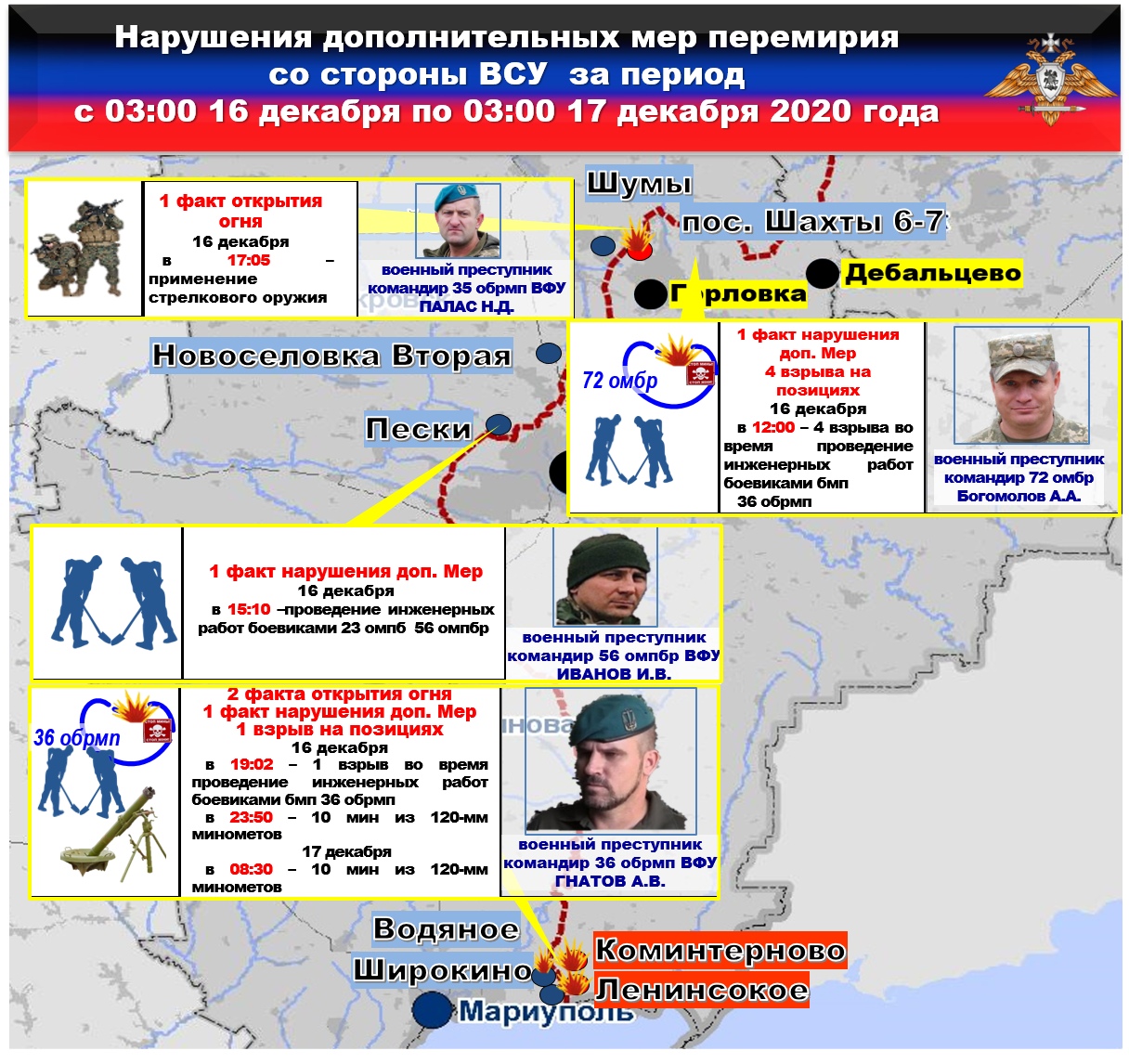 Отмечаем, что в отношении ГНАТОВА, украинская сторона так и не предоставила разбирательств, для привлечения его к ответственности, в соответствии с ЧЕТВЕРТЫМ пунктом дополнительных мер ни по одному факту нарушения перемирия. Призываем международных наблюдателей зафиксировать нарушения со стороны ВФУ и способствовать проведению разбирательств в отношении командира 36 бригады ВФУ ГНАТОВА.