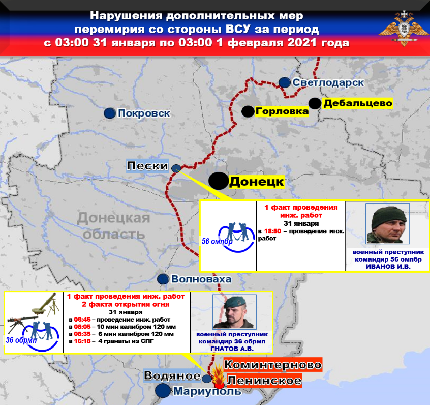 Так, на Мариупольском направлении, боевики с позиций батальона морской пехоты 36 бригады ВФУ, в нарушение ВТОРОГО пункта дополнительных мер, в районе н.п. ВОДЯНОЕ выпустили по району н.п. ЛЕНИНСКОЕ ШЕСТНАДЦАТЬ мин из 120-мм минометов, запрещенных Минскими соглашениями и по району н.п. КОМИНТЕРНОВО ШЕСТЬ гранат из СПГ.