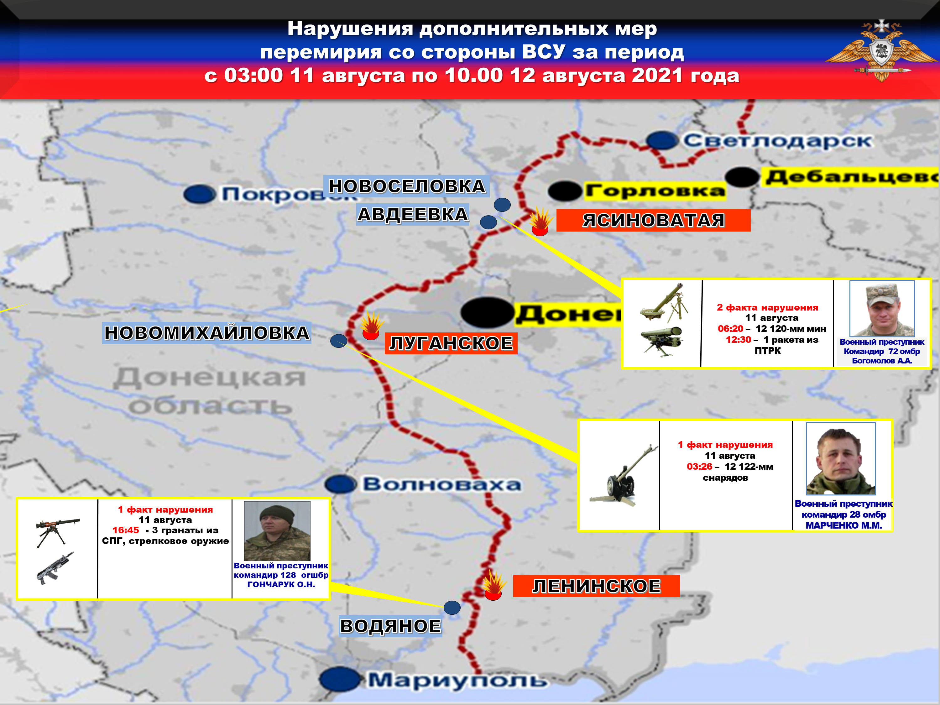 Факты нарушений в оперативном порядке доведены до представителей украинской стороны в СЦКК, с целью своевременного принятия мер к нарушителям перемирия и исключения фальсификации данных о нарушениях режима прекращения огня со стороны украинских боевиков.