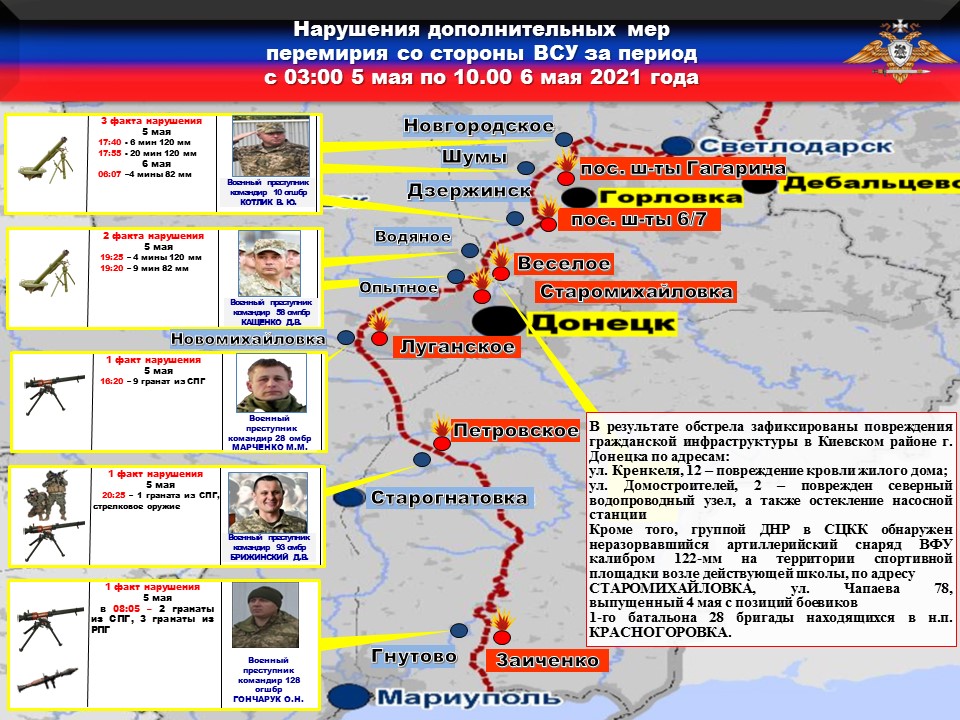 Факты нарушений в оперативном порядке доведены до представителей украинской стороны в СЦКК, с целью своевременного принятия мер к нарушителям перемирия и исключения случаев фальсификации учетных данных о нарушениях режима прекращения огня со стороны украинских боевиков.