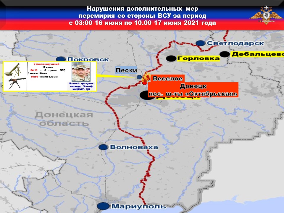 Факты нарушений в оперативном порядке доведены до представителей украинской стороны в СЦКК, с целью своевременного принятия мер к нарушителям перемирия и исключения случаев фальсификации учетных данных о нарушениях режима прекращения огня со стороны украинских боевиков.