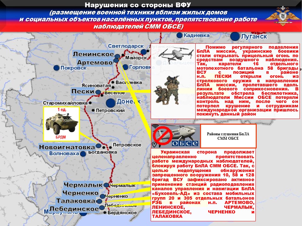 Украинская сторона продолжает целенаправленно препятствовать работе международных наблюдателей, блокируя работу БпЛА СММ ОБСЕ. Так, с целью недопущения обнаружения запрещенного вооружения 10, 58 и 128 бригад ВСУ зафиксировано активное применение станций радиоподавления каналов управления и навигации БпЛА «Буковель-АД» из состава мобильных групп 20 и 305 отдельных батальонов РЭБ в районах н.п. АРТЕМОВО, ЛЕНИНСКОЕ, ЧЕРМАЛЫК, ЛЕБЕДИНСКОЕ, ЧЕРНЕНКО и ТАЛАКОВКА.