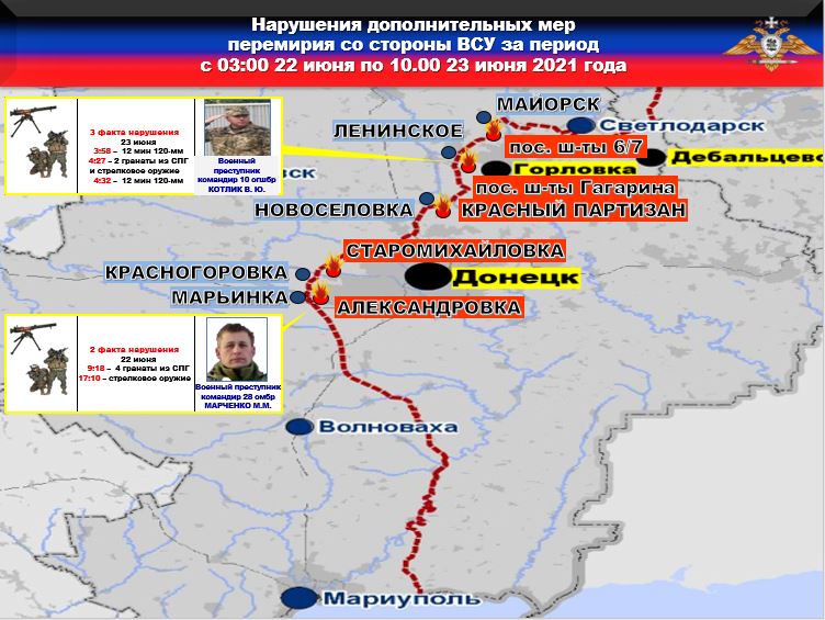 Так на Горловском направлении боевики 10 огшбр ВСУ по приказу комбрига КОТЛИКА ДВАЖДЫ открывали огонь с позиций в районе н.п. МАЙОРСК, обстреляли из СПГ и стрелкового оружия район поселка шахты «6/7», а с позиций в районе н.п. ЛЕНИНСКОЕ выпустили ДВЕНАДЦАТЬ 120-мм мин по поселку шахты Гагарина.