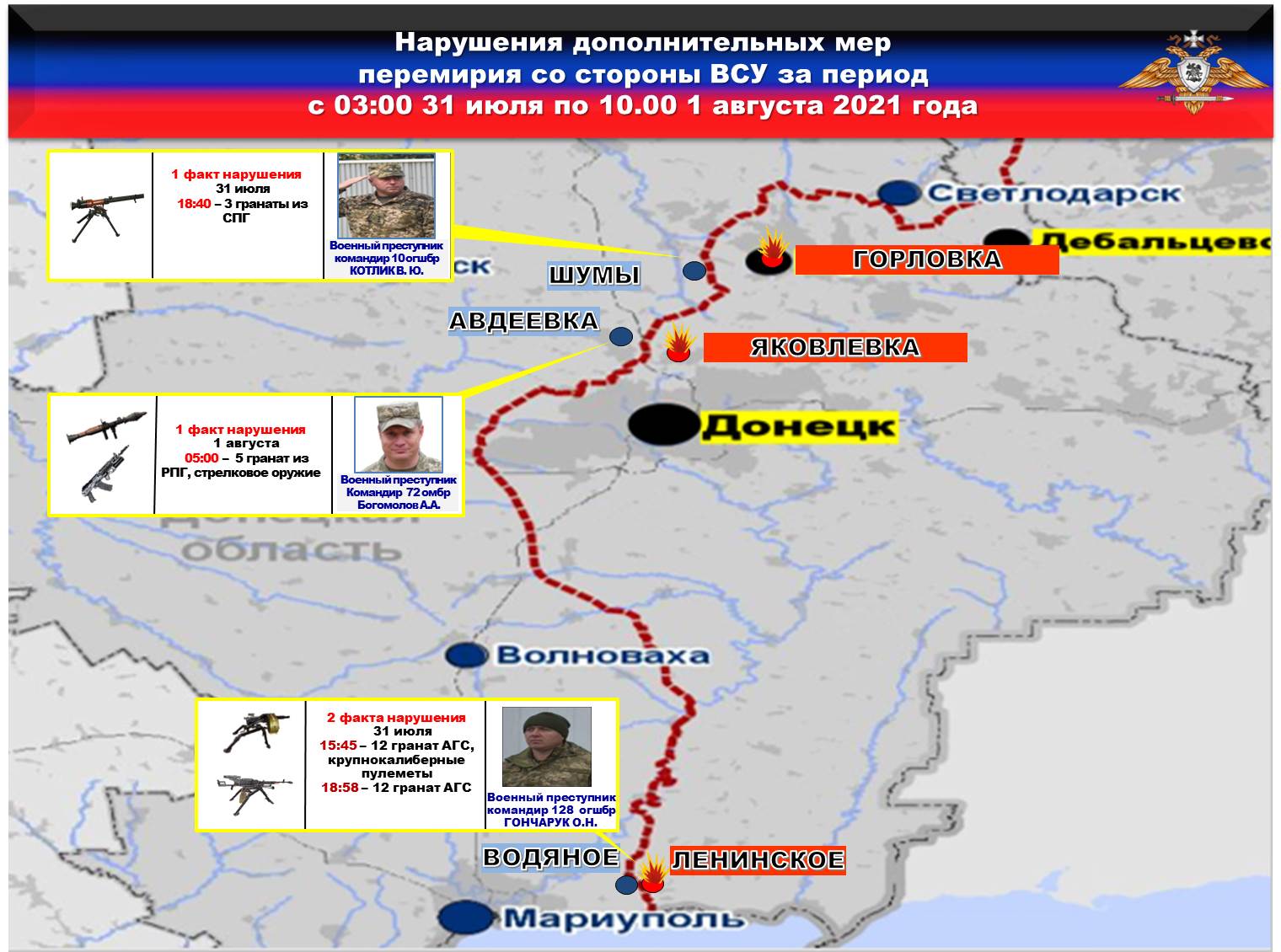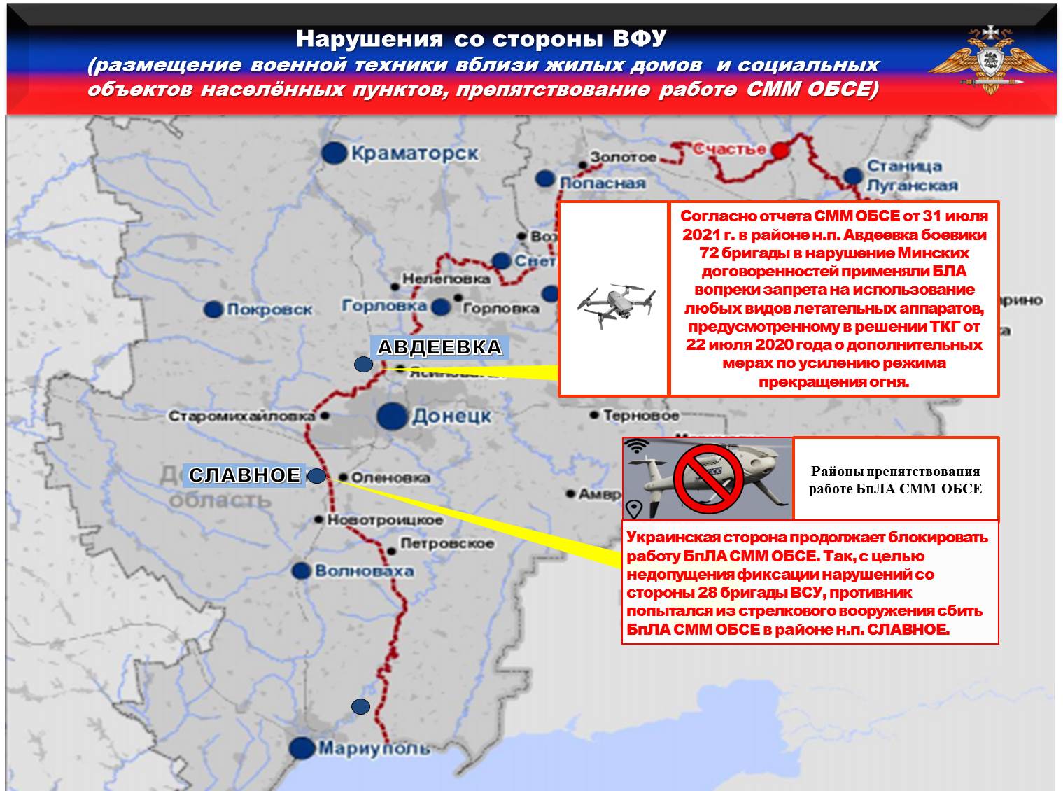 Также согласно отчета СММ ОБСЕ от 31 июля 2021 г. в районе н.п. Авдеевка боевики 72 бригады в нарушение Минских договоренностей применяли БЛА вопреки запрета на использование любых видов летательных аппаратов, предусмотренному в решении ТКГ от 22 июля 2020 года о дополнительных мерах по усилению режима прекращения огня.