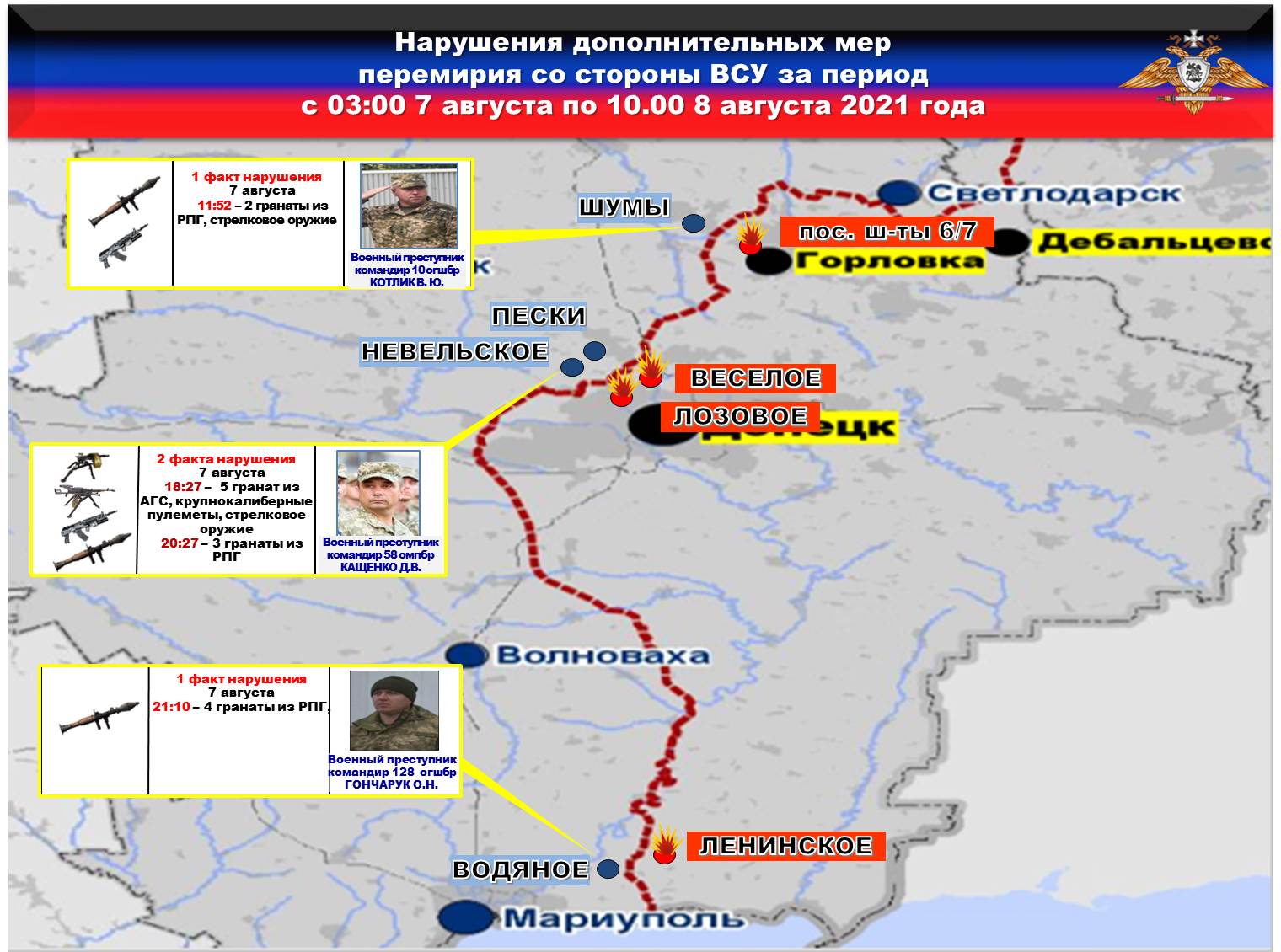 Факты нарушений в оперативном порядке доведены до представителей украинской стороны в СЦКК, с целью своевременного принятия мер к нарушителям перемирия и исключения фальсификации данных о нарушениях режима прекращения огня со стороны украинских боевиков.