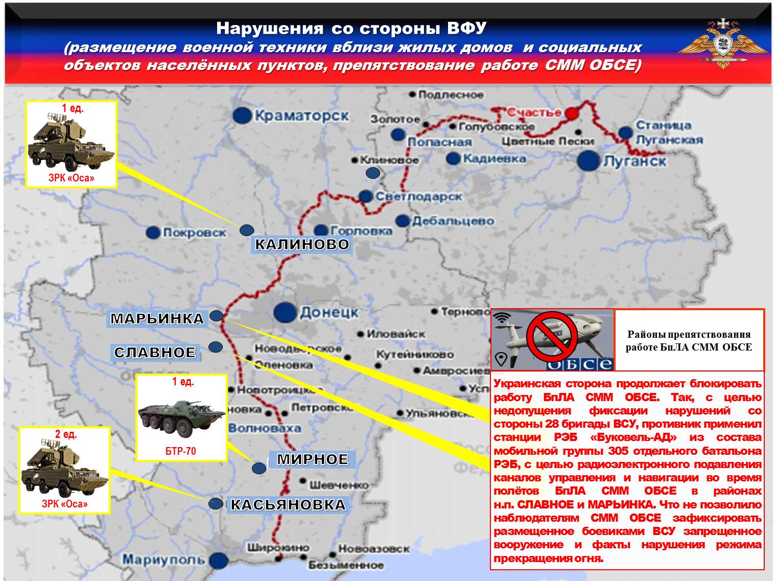Украинская сторона продолжает блокировать работу БпЛА СММ ОБСЕ. Так, с целью недопущения фиксации нарушений со стороны 28 бригады ВСУ, противник применил станции РЭБ «Буковель-АД» из состава мобильной группы 305 отдельного батальона РЭБ, с целью радиоэлектронного подавления каналов управления и навигации во время полётов БпЛА СММ ОБСЕ в районах н.п. СЛАВНОЕ и МАРЬИНКА. Что не позволило наблюдателям СММ ОБСЕ зафиксировать размещенное боевиками ВСУ запрещенное вооружение и факты нарушения режима прекращения огня.