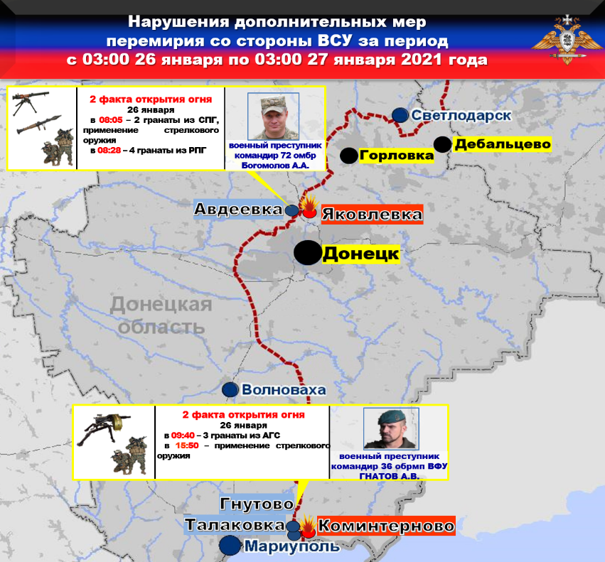 Также, нами зафиксировано нахождение ДВУХ военнослужащих 53 омбр на бывших позициях ВСУ на участке разведения ПЕТРОВСКОЕ. Данные факты, также подтверждаются официальным отчетом СММ ОБСЕ от 26 января 2021 г.