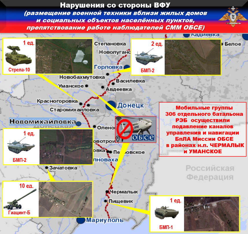 Украинская сторона продолжает препятствовать работе Международных наблюдателей. Так, с целью недопущения обнаружения беспилотниками СММ ОБСЕ запрещенного вооружения в зоне ответственности 72 и 53 бригад ВФУ, зафиксировано применение в районах н.п. УМАНСКОЕ, ЧЕРМАЛЫК мобильных групп 306 об РЭБ с задачей подавления станцией «Букавель-АД» каналов управления и навигации миссии ОБСЕ.
