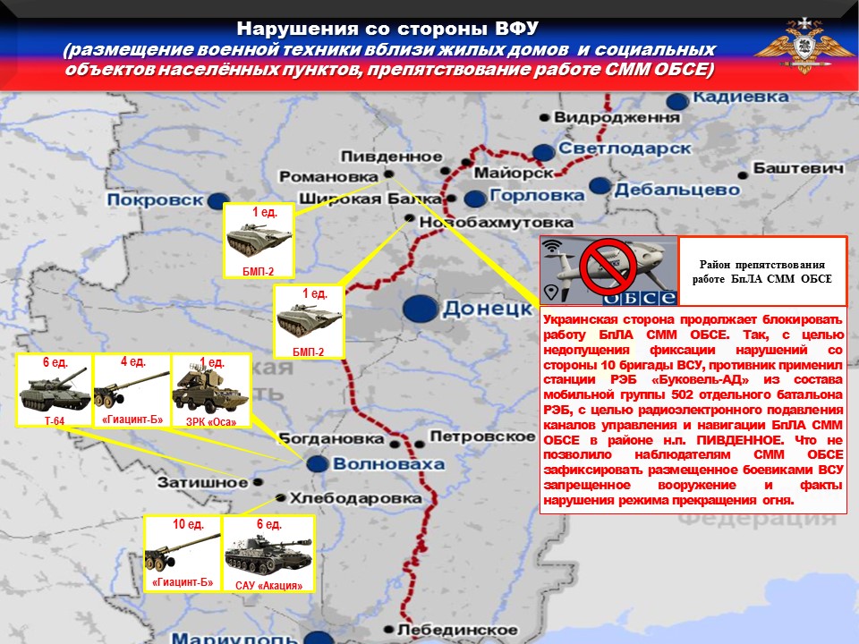 Украинская сторона продолжает блокировать работу БпЛА СММ ОБСЕ. Так, с целью недопущения фиксации нарушений со стороны 10 бригады, противник применил станцию РЭБ «Буковель-АД» из состава мобильной группы 305 отдельного батальона РЭБ, с целью радиоэлектронного подавления каналов управления и навигации БпЛА СММ ОБСЕ в районах н.п. ЛЕНИНСКОЕ.
