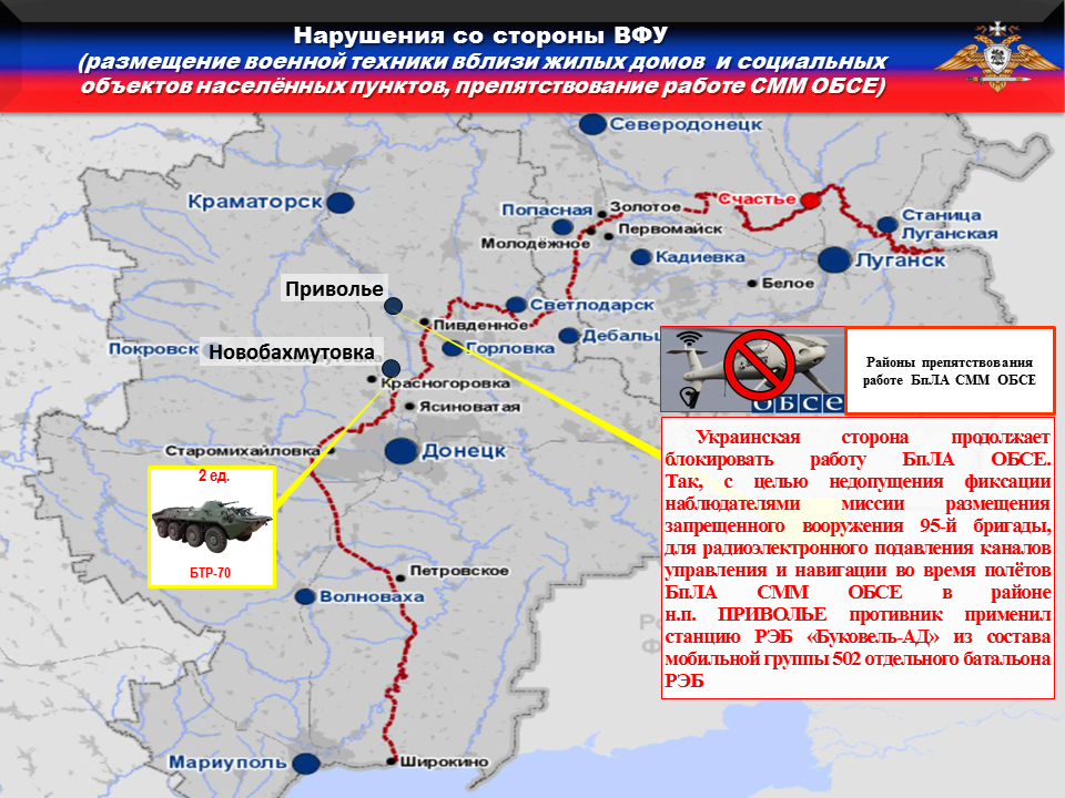 Украинская сторона продолжает блокировать работу БпЛА ОБСЕ. Так, с целью недопущения фиксации наблюдателями миссии размещения запрещенного вооружения 95-й бригады, для радиоэлектронного подавления каналов управления и навигации во время полётов БпЛА СММ ОБСЕ в районе н.п. ПРИВОЛЬЕ противник применил станцию РЭБ «Буковель-АД» из состава мобильной группы 502 отдельного батальона РЭБ.