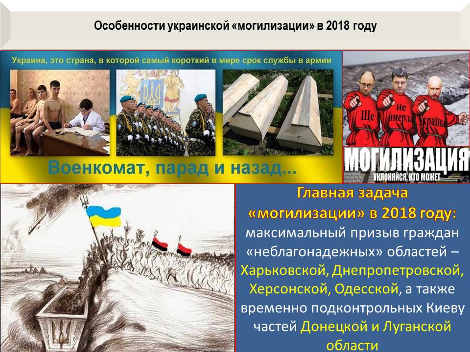 Таким образом, украинская власть пытается убить сразу двух зайцев: выполнить план мобилизации и «замазать» кровью граждан этих областей через убийство своих соотечественников в этой гражданской войне, которую Киев называет «АТО».