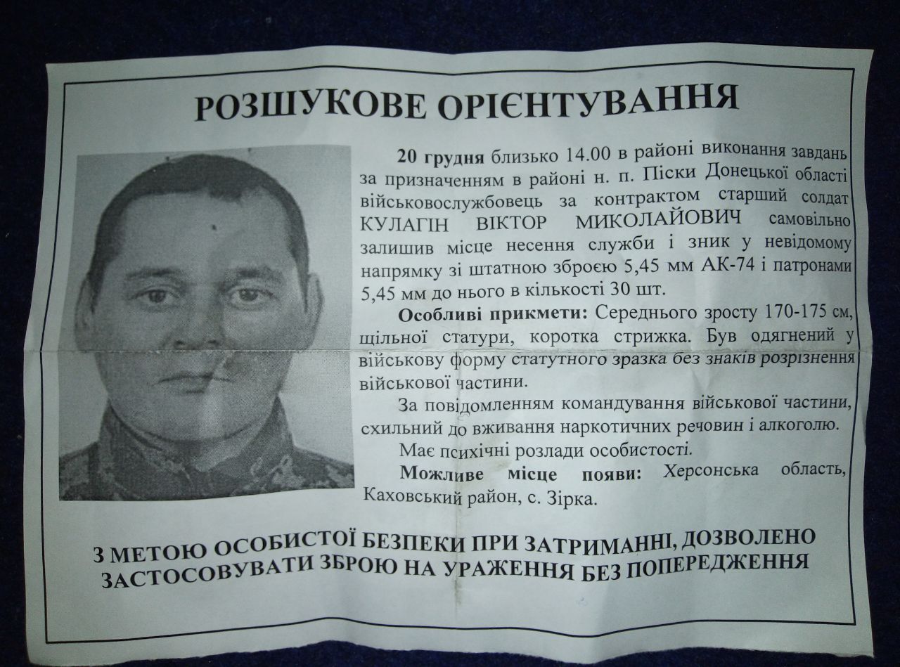 Так, по нашим данным, командование 56-й бригады передало в ВСП ориентировку, в которой было указано: старший солдат КУЛАГИН покинул часть с оружием, склонен к употреблению алкоголя и наркотических веществ, а также агрессивен и психически неуравновешен. Важно обратить внимание на особую отметку в ориентировке, что, в случае неповиновения КУЛАГИНА при задержании, рекомендуются применять оружие на поражение.