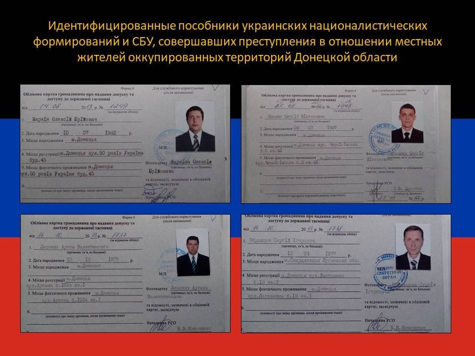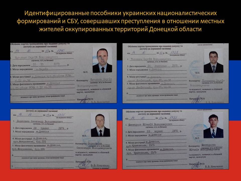 В нашем распоряжении оказались электронные носители информации и различные документальные подтверждения, обнаруженные при обследовании освобожденных населенных пунктов Волноваха, Старогнатовка и Новотроицкое, со списками сотрудников СБУ и сотрудничавших с ними местных жителей, осуществлявших доносы на своих знакомых и соседей не разделяющих героизацию нацистских преступников и репрессивную украинизацию, а также передававших информацию о военных объектах, военнослужащих и жителях Донецкой Народной Республики.