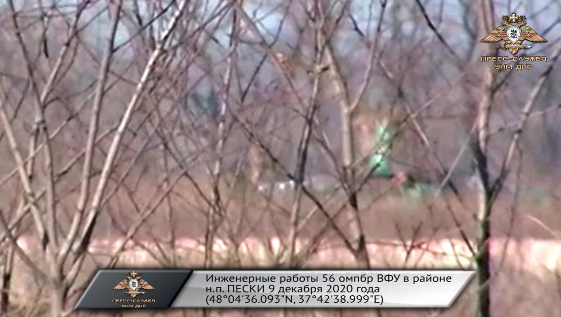 Представляем видеокадры, зафиксированные нашими системами видеонаблюдения, о проведении 9 декабря боевиками 23 мотопехотного батальона 56 омпбр ВФУ инженерных работ в районе н.п. ПЕСКИ.
